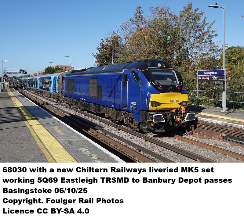 2024. Sep Current Pool - TPEX (Trans Penine Express Class 68 Locomotives ) Current Depot LM (S) - Long Marston - Stored 2024. Oct - TO POOL XHTP (Direct Rail Services Class 68 for hire to TransPennine Express-spare locomotives ) 2025. Mar - TO - Pool MBDL (Non TOC Owned Diesel Locomotives ) TO Depot LB (S) (Loughborough Works - Stored) 2025. Aug - TO be Leased to Chiltern Rail by owner Beacon Rail 2025. Nov - Current POOL - MBDL (Chiltern Railways Holding Pool) Current DEPOT - WC - Wembley (Chiltern) Light Maintenance Depot |