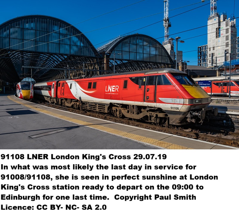 91008 1988. Jul - Allocated to Depot BN - Bounds Green 1994. Apr - To Leasing/Owning Company - Eversholt Rail 1996. - Leased to Operator - Great North Eastern Railway - GNER 2001. Nov - Modified to Class 91/1 and number changed 91108 2007. - Leased to Operator - National Express East Coast 2009. - Leased to Operator - East Coast 2015. - Leased to Operator - Virgin Trains East Coast 2018. - Leased to Operator - London North Eastern Railway - LNER 2019. Jul - Withdrawn 2019 Jul .-TO store at Depot ZB - Doncaster Works 2022. May - Scrapped |